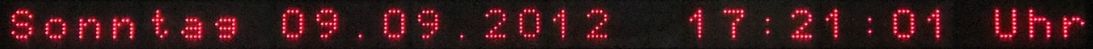 Was zur Anzeige kommen soll, schreibt das Programm in die Zeichenkette "Zeile" (String mit 32 Stellen). Ich beschreibe hier nur beispielhaft eine Anzeigevariante, bei der eine komplette Zeile mit Wochentag, Datum und Uhrzeit angezeigt wird. Die Anzeige wechselt sonst im Betrieb zwischen Temperatur, nächster Weckzeit, Radiofrequenz oder Sendername. Bei der Programmierung habe ich bemerkt, das es sinnvoll ist, den String möglichst von links nach rechts auzubauen. Der Einsatz des Befehls "Mid(variable,x,y) ist ziemlich speicher- und rechenintensiv. Da zeitgleich hier aber über 1000 Leuchtdioden multiplex angesteuert werden und die Anzeige nicht flackern sollen, kommt es auf jede Mikrosekunde an.
